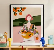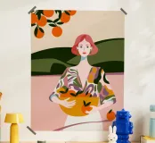 Cette peinture représente une personne tenant un panier d'oranges, vêtue de vêtements éclatants, dans un paysage d'arbres et de collines. Elle symbolise la joie de la récolte.