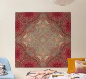Ce design présente un ornement dans le style d'un mandala ou d'un kaléidoscope. Les formes géométriques sacrées et symétriques, les cercles concentriques et les textures de lignes avec leurs détails compliqués donnent un motif complexe avec un rayonnement sacré, visuel et illusionniste. Ornement en rouge bordeaux. Pour les amateurs de motifs rustiques, orientaux, .... "à l'ancienne" ... des textures finement structurées.