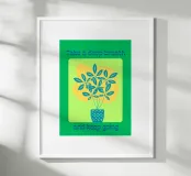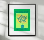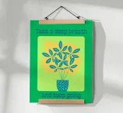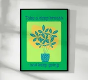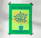Cette illustration lumineuse et colorée nous rappelle qu'il faut prendre un moment pour soi et continuer à aller de l'avant. Le dessin simple présente une plante en pot sur fond jaune, créant un sentiment de calme et de positivité.