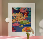 Une composition très abstraite et colorée présentant des formes ressemblant à des théières au milieu de motifs tourbillonnants et de teintes vibrantes, suggérant une fête du thé fantaisiste.