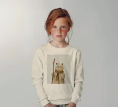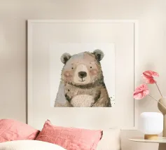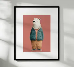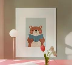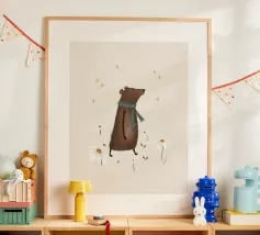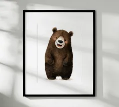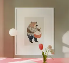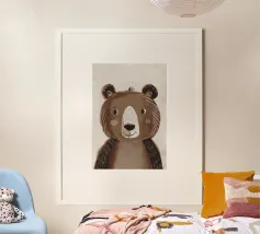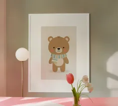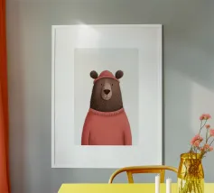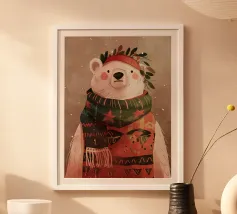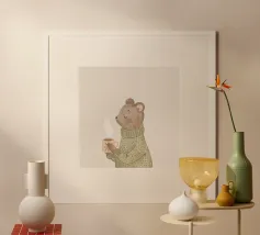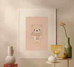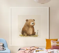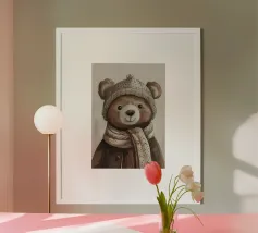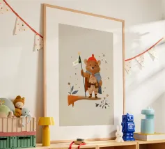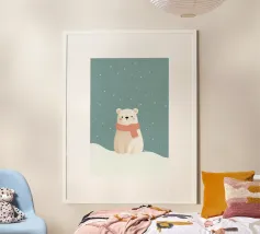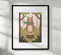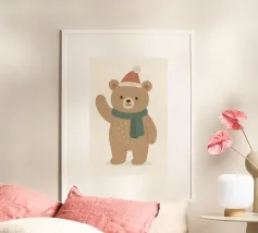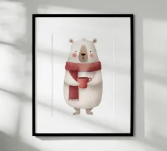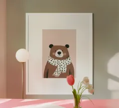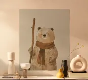 Enveloppé dans une écharpe douillette et tenant un bâton de marche, ce gentil ours se tient debout avec curiosité et courage tranquille. Une illustration minimale et poétique qui apporte un esprit chaleureux de livre d'histoires dans la chambre de votre enfant.