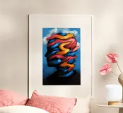Un profil noir, entouré de puissants coups de pinceau en bleu, rouge et orange, semble se dissoudre dans le vent. Les couleurs semblent être des flux d'énergie qui s'échappent de la tête et se connectent au ciel. Les frontières entre l'homme et son environnement s'estompent, comme si l'esprit se mettait en mouvement et se dissolvait. Une métaphore visuelle du changement, de la liberté de pensée et du lâcher prise de sa propre forme.