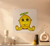 Figure de citron souriante de style kawaii avec de grands yeux et des chaussettes vertes à anneaux - un design mignon pour les fans de fruits et les enfants.Citron mignon comme figure kawaii Grands yeux de fouine et sourire mignon Chaussettes rayées vertes et jaunes colorées Idéal pour les enfants et les amateurs de fruits Parfaites pour des designs kawaii ludiques