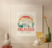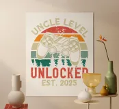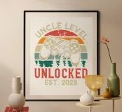 Le graphisme d'une manette de jeu de style rétro est agrémenté de rayures colorées et des mots "Uncle Level Unlocked" au-dessus et "Est. 2025" en dessous. Le design associe une esthétique vintage à une approche ludique de la culture des jeux.