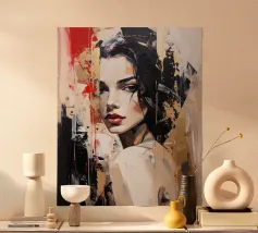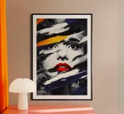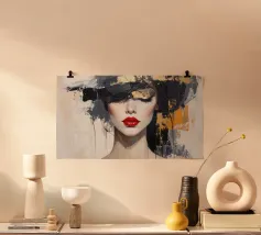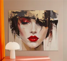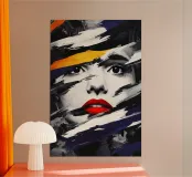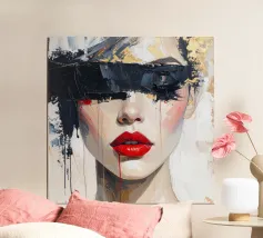 Un visage monochrome se détache grâce à des coups de pinceau dynamiques en noir, blanc et bleu foncé. Seuls les yeux expressifs et les lèvres rouge vif rompent l'abstraction, tandis qu'une touche d'orange apporte des accents. La combinaison de l'art du portrait réaliste et de l'expressionnisme abstrait crée un champ de tension mystérieux et puissant entre dissimulation et révélation.