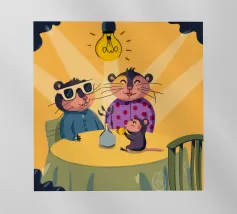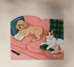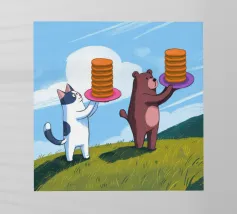 Cette œuvre d'art représente un nuage à l'air grincheux avec une bulle de pensée contenant un oiseau et un ours. La scène humoristique et imaginative se déroule sur un fond bleu doux.