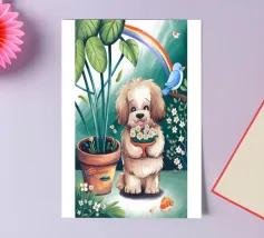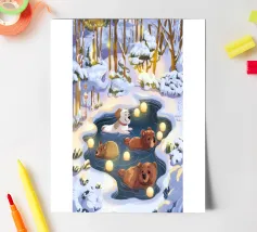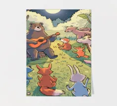 This artwork depicts a grumpy-looking cloud with a thought bubble containing a bird and a bear. The humorous and imaginative scene is set against a soft blue background.