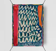 A complex weave of U-shapes, varied line work, and organic elements in pinks, yellows, white, and teal against a dark background creates a mysterious, pattern-based tapestry.