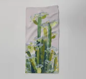 Cette œuvre d'art délicate représente des cactus verts avec des fleurs bleu clair, peints dans des couleurs pastel douces. La combinaison de douces nuances de beige et de vert confère au motif une atmosphère chaleureuse et naturelle. Inspiré par la botanique du désert, ce tableau végétal minimaliste est d'une légèreté estivale.
