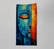Cette composition ésotérique d'inspiration cubiste et émotionnellement touchante divise le visage féminin en deux mondes : La moitié gauche s'enfonce dans des tons bleus glacés, tandis qu'à droite, des tons chauds d'orange et de rouge flamboient. La fragmentation géométrique rappelle le cubisme de Picasso, mais la palette de couleurs lumineuses et le pinceau pastose confèrent à l'œuvre une force contemporaine. L'œil en forme d'amande - à la fois fenêtre et énigme - fixe le spectateur de manière hypnotique. Une méditation pénétrante sur les contrastes intérieurs, la dualité et la complexité de l'identité humaine.