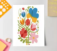 Un patchwork vibrant de différents motifs, combinant des éléments floraux, des formes abstraites et des motifs carrelés. Le mélange éclectique de couleurs et de styles crée une composition visuellement riche et joyeuse, rappelant un mur de carreaux méditerranéens.