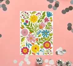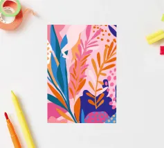 Composition abstraite moderne de diverses formes botaniques stylisées et de feuilles dans une palette de terracotta, de beige et de bleu foncé sur un fond clair.