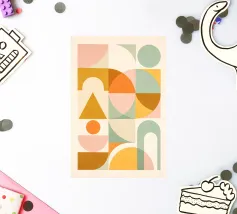 Une œuvre d'art abstraite composée de formes géométriques dans les tons vert terre, orange et beige, disposées de manière équilibrée sur un fond clair texturé.