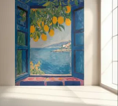 Une vue de fenêtre pleine d'été : ce poster coloré montre des citrons mûrs devant une fenêtre bleue ouverte avec vue sur la mer azurée. La scène rappelle l'Italie ou la Grèce et respire la légèreté méditerranéenne. Idéal comme tableau mural pour la cuisine, la salle à manger ou le salon - parfait pour apporter une ambiance de vacances dans ta maison. Artistique, vivant et plein de joie de vivre.