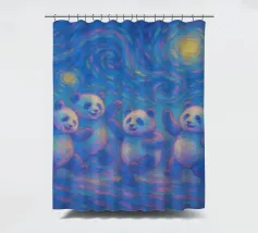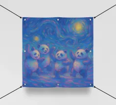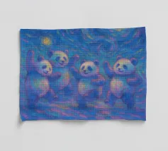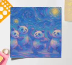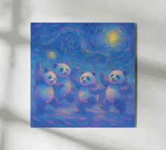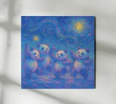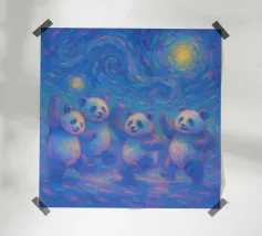 Apportez de la joie et de la couleur à n'importe quel espace avec cette œuvre d'art fantaisiste représentant quatre pandas enjoués dansant sous un ciel nocturne étoilé et tourbillonnant. Inspiré par des coups de pinceau expressifs et des teintes oniriques, le dessin allie charme, mouvement et énergie vibrante. Parfaite pour les chambres d'enfants, les crèches et tous ceux qui aiment l'art mignon et exaltant, cette pièce ajoute chaleur et imagination à votre décor. Fusion délicieuse de fantaisie et d'art, elle ne manquera pas de susciter des sourires et d'illuminer votre mur de sa lueur nocturne magique.