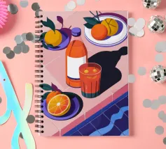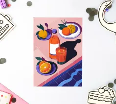 Une table au bord de la piscine présente des oranges, une bouteille de jus de fruit et un verre, le tout entouré d'une eau sereine et d'une atmosphère relaxante. L'ensemble dégage une impression de fraîcheur et de tranquillité.
