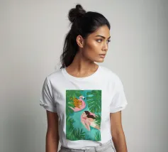 La lumière du soleil filtre à travers les feuilles tropicales alors qu'elle flotte paisiblement dans une piscine, complètement à l'aise. Le monde qui l'entoure s'évanouit dans des couleurs douces et des formes tranquilles - les boules de plage, les sandales et le temps lui-même sont tous laissés derrière elle. Expiration visuelle, cette œuvre nous rappelle qu'il faut faire une pause, respirer et laisser le repos nous suffire.