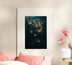 Un cœur colossal, usé par les intempéries, flotte sereinement au-dessus d'un vaste paysage craquelé, symbole puissant d'un amour durable dans un monde désolé. Deux petits personnages se tiennent en sa présence, ajoutant à l'échelle épique et à l'aspect cinématographique de cette œuvre d'art surréaliste. Avec ses tons vintage et son imagerie qui pousse à la réflexion, cette œuvre est un sujet de conversation et un hommage au grand voyage de l'amour.