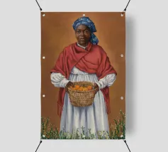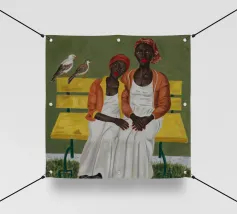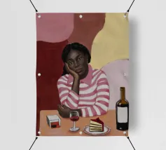 Cette œuvre d'art montre une personne assise sur une chaise rayée, entourée de tournesols et d'un sac vert. L'arrière-plan est d'un brun sourd, créant une atmosphère rustique et réfléchie.