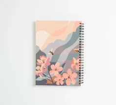 The detailed design features a variety of vibrant flowers visited by busy bees.