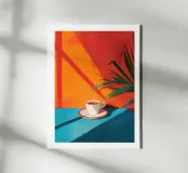 Illuminez votre cuisine avec cette affiche vibrante et chaleureuse représentant une tasse de café sur une table baignée de lumière. Les tons éclatants d’orange, de bleu et de vert, combinés à des ombres tropicales, évoquent une ambiance relaxante et inspirante pour votre espace culinaire. Idéale pour les amateurs de café et de décoration contemporaine, cette œuvre apporte une touche de style ensoleillée et énergisante. Parfaite pour une cuisine moderne, une salle à manger ou un café, cette affiche rehaussera vos murs avec élégance et créativité.