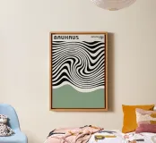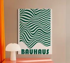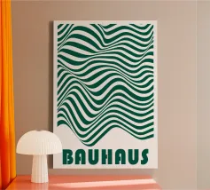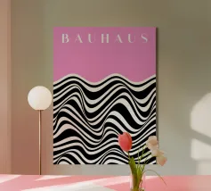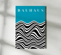 Cette œuvre d'art audacieuse du Bauhaus présente des lignes ondulées hypnotiques en noir et blanc qui s'écoulent à travers la composition, avec le texte de l'exposition du Bauhaus dans une mise en page moderniste classique. Une œuvre abstraite saisissante qui allie le design allemand vintage à l'art graphique intemporel. Livré en très haute résolution (7000x5000 pixels, 300 dpi), parfait pour les amateurs de design et les intérieurs minimaux.