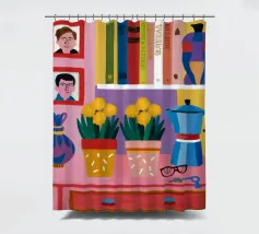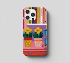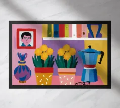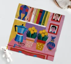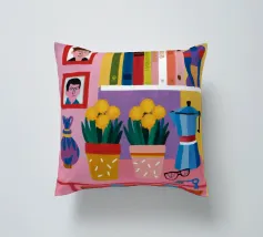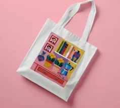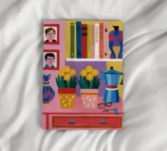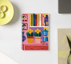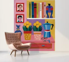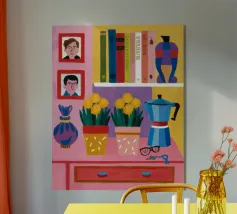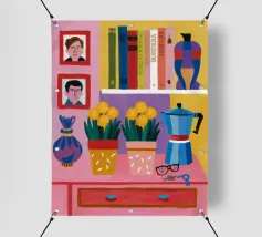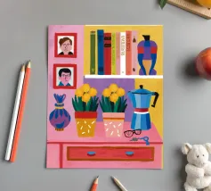 Scène d'intérieur colorée représentant une étagère remplie de livres, une cafetière et une plante, suggérant un coin lecture confortable ou un bureau à domicile. Le style est vif et illustratif.