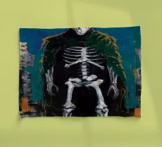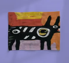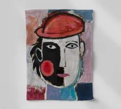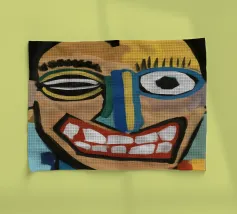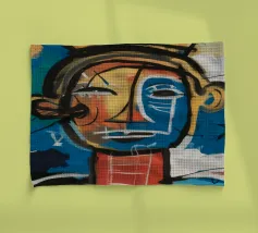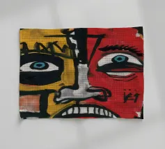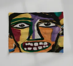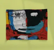 Un mélange chaotique de rouge, de jaune et de bleu divise le visage en sections éparses, reflétant la complexité et l'identité désarticulée. Des lignes griffonnées renforcent sa nature brute et expressive.
