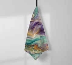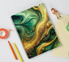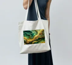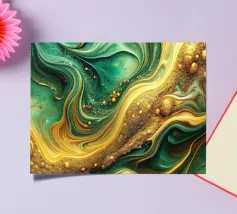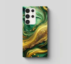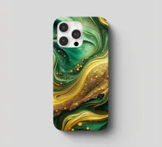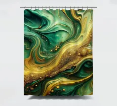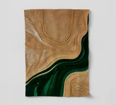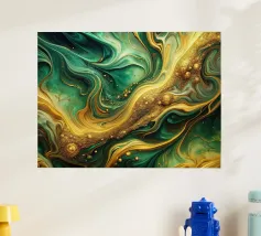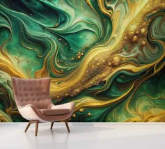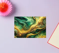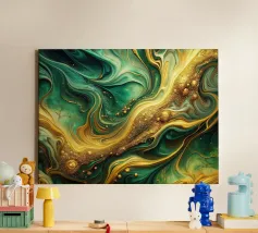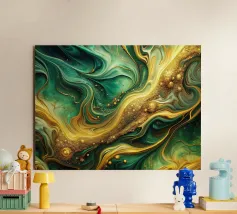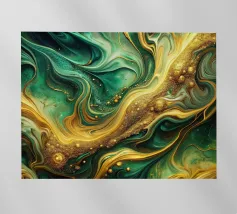 Un torrent de fluide vert et or se met en mouvement, mêlant la vitalité de l'émeraude à l'opulence de l'or liquide. La composition s'écoule avec élégance et énergie, comme si la nature et le luxe se fondaient en une seule impulsion. Les reflets dorés illuminent le vert profond, créant un jeu de lumière, de texture et de mouvement qui évoque quelque chose d'organique et de majestueux. Chaque courbe du fluide semble danser, capturant le moment fugace où la matière se transforme en art. L'œuvre transmet harmonie, puissance et sophistication, une métaphore visuelle de l'énergie vitale transformée en beauté dorée.
