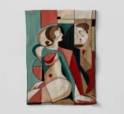 Cette peinture représente deux figures abstraites dans une pose intime. L'utilisation de formes géométriques et de couleurs vives ajoute de la profondeur et de la complexité à la scène.