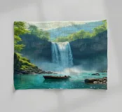 Un petit bateau dérive paisiblement sur l'eau claire tandis qu'une cascade pittoresque se déverse le long de falaises rocheuses, encadrée par une verdure éclatante dans un cadre paisible.