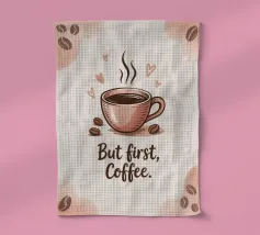 Illustration moderne et minimaliste d'une tasse de café rose avec une citation pour tous les amateurs de café.