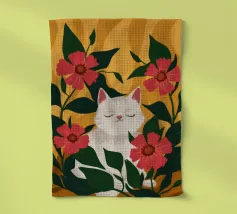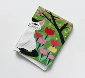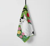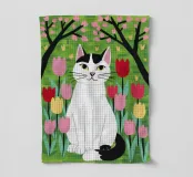 Une illustration douce et fantaisiste d'un grand chat noir et blanc assis sereinement dans un jardin de tulipes roses et rouges, avec des cerisiers en fleurs au-dessus. Cette œuvre d'art est une belle célébration du printemps, des chats et des fleurs.