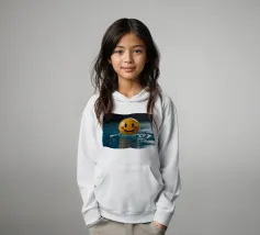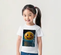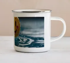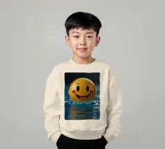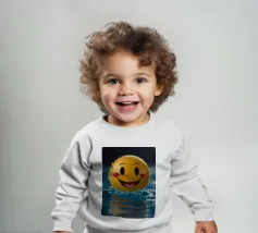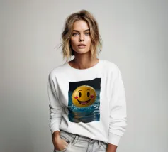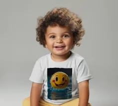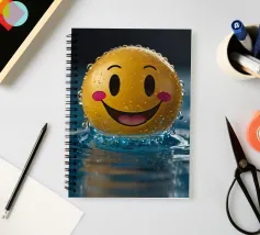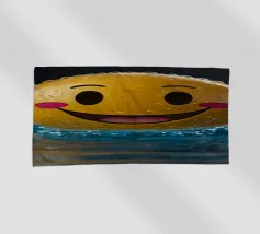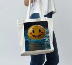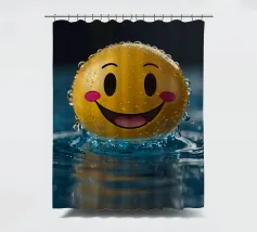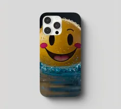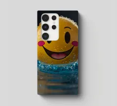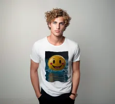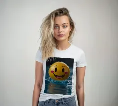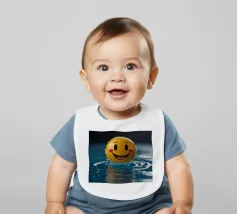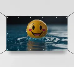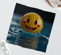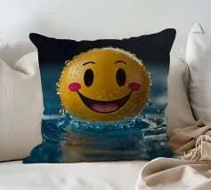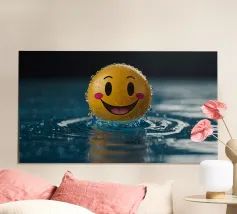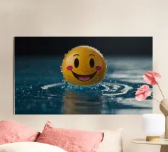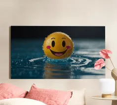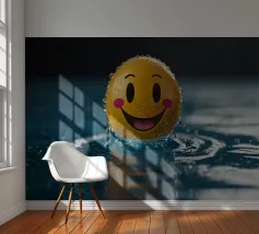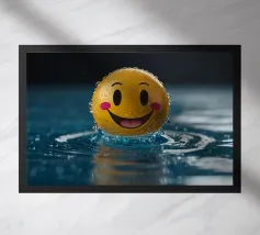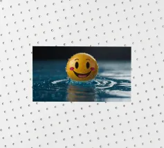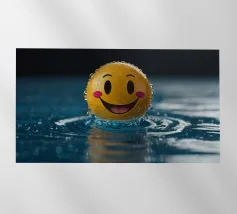 Un smiley jaune vif flotte à la surface d'une eau calme, entouré de gouttelettes qui scintillent tandis que des ondulations se forment, évoquant un sentiment de joie et de tranquillité.
