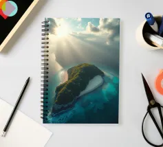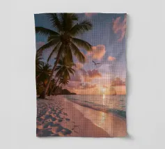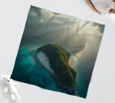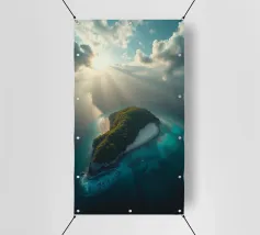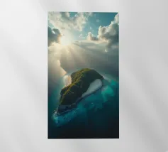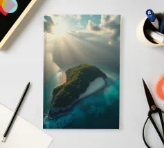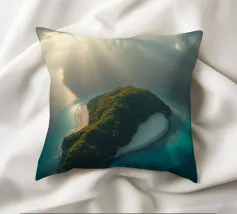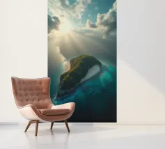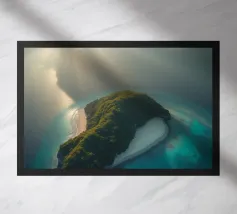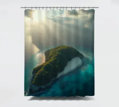Des rayons de soleil dorés illuminent une île tranquille avec une végétation luxuriante, une plage de sable doux et des eaux d'un turquoise éclatant sous un ciel partiellement nuageux.