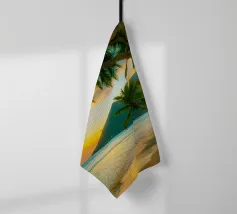 Le soleil couchant jette une lumière chaude sur une île isolée entourée d'eaux turquoises. La verdure luxuriante contraste magnifiquement avec les rivages sablonneux et le ciel éclatant.