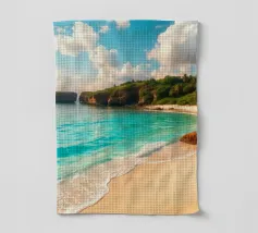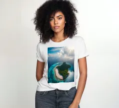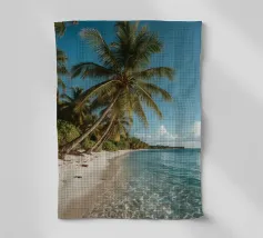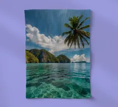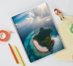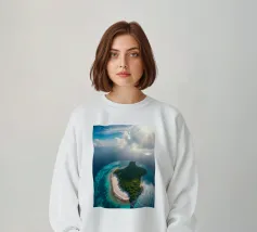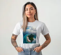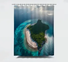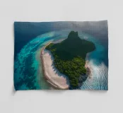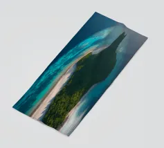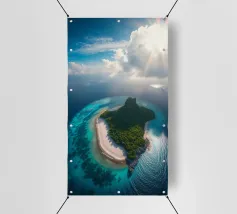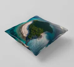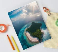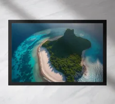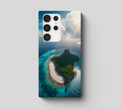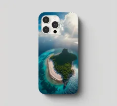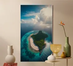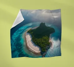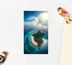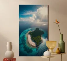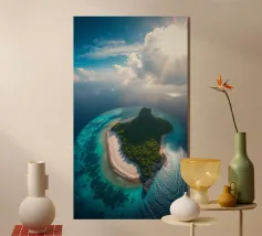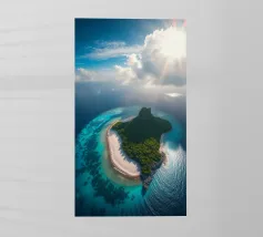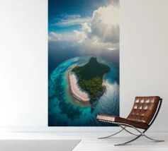 Une perspective aérienne montre une île luxuriante avec de la verdure, des plages de sable et des eaux turquoises, sous un ciel lumineux avec des nuages épars, soulignant sa beauté lointaine.