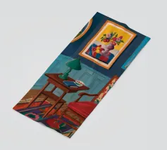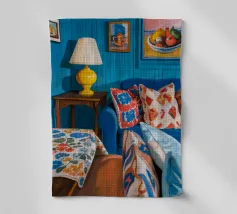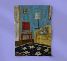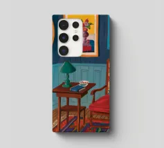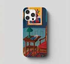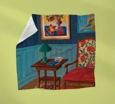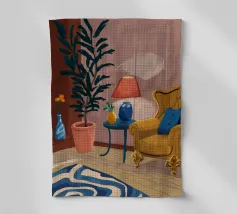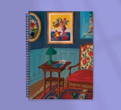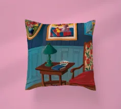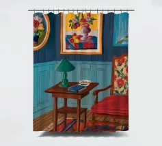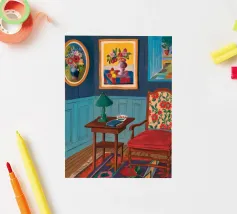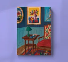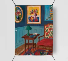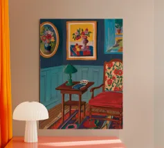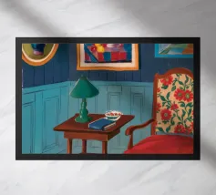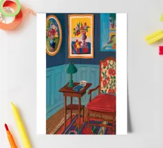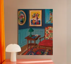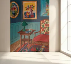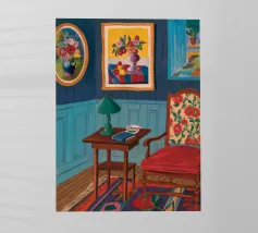 Vue d'un salon confortable et traditionnel avec un fauteuil à fleurs, une table d'appoint et des œuvres d'art encadrées. Les couleurs riches et le mobilier classique créent une atmosphère chaleureuse, accueillante et intime.
