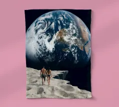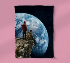 Nous vivions là avant. Vous vous souvenez ? Ce monde nous attend toujours. ~ couple assis sur un banc regardant la Terre composition romantique surréaliste rétro futuriste étoilée . version horizontale