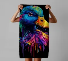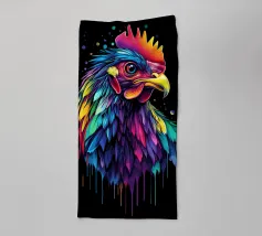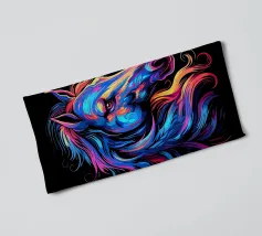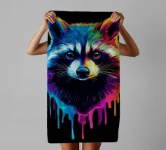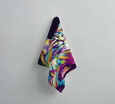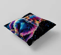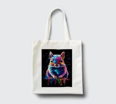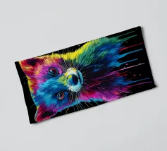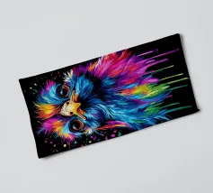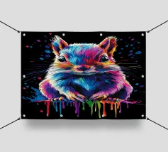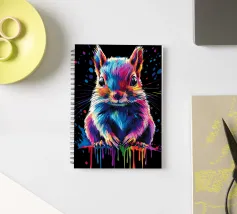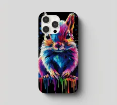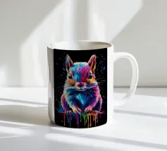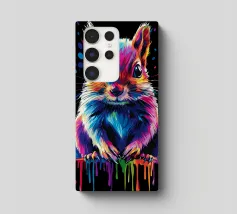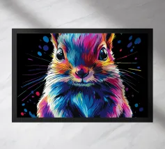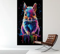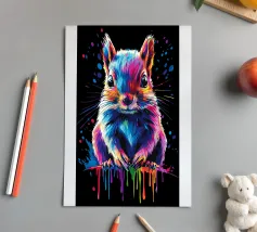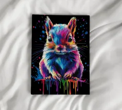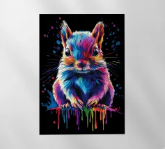 Un écureuil coloré regarde directement l'appareil photo avec de grands yeux expressifs. L'illustration utilise une large palette de couleurs vives - dont le bleu, le rose, le violet, le rouge et le jaune - qui font paraître le pelage vivant. Le dégradé de couleurs qui s'étend des oreilles aux pattes et qui se termine par des taches et des gouttes de couleurs vives est particulièrement frappant. Le fond est d'un noir profond, ce qui fait ressortir encore plus les couleurs brillantes et confère au motif un aspect moderne et dynamique.