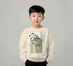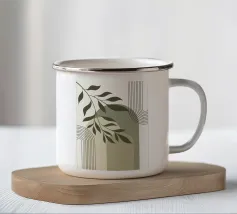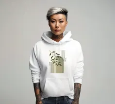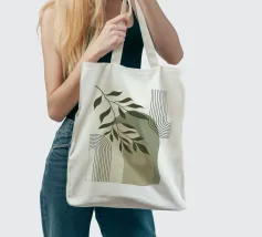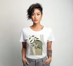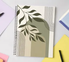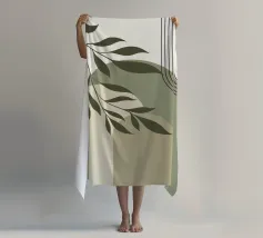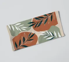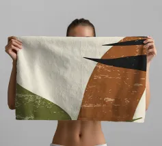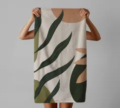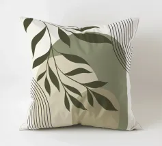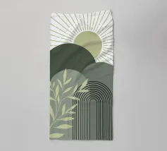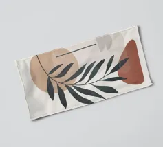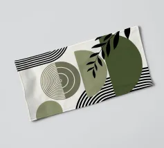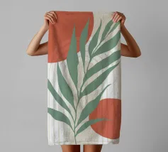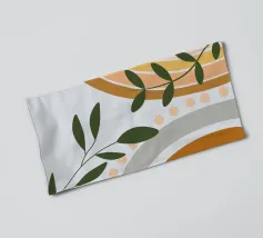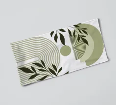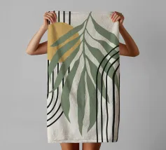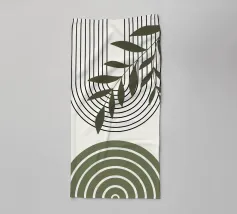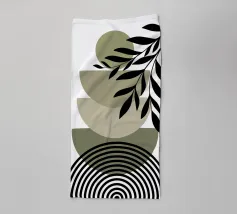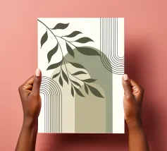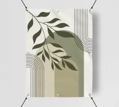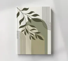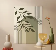 Une branche de feuille se superpose à des formes géométriques, notamment des lignes arquées et des tons sourds et superposés. Cette combinaison crée un mélange harmonieux de nature et de design abstrait.