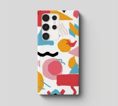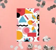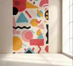 Une composition abstraite chaotique et amusante dans le style Memphis, avec un assortiment aléatoire de formes géométriques, de gribouillis et de motifs. L'œuvre est énergique, ludique et a une ambiance rétro.