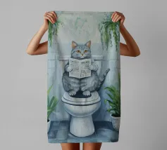 Funny bathroom toilet art of the Mona Lisa sitting on a white porcelain toilet against a backdrop of dark wood panelling. One hand holds a crumpled tissue in her lap, the other brings another tissue to her nose. Black-and-white checkerboard floor tiles, with gold toilet paper holder with a roll of toilet paper in it. There is a matching gold toilet brush holder to the side of the toilet. Overall the image is of the iconic Mona Lisa portraiture with a absurd circumstance of her using the bathroom toilet. The result is a humorous classical portrait.