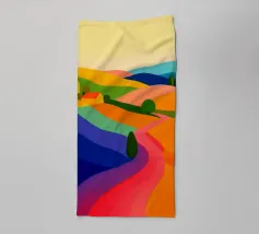 Une vue pittoresque de champs en patchwork ondulés, rendus dans des pastels audacieux, créant un paysage onirique.
