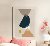 Ce design moderne se distingue par une composition minimaliste de formes abstraites et de tons chauds comme le beige, le bleu foncé, le blanc et le jaune moutarde. La disposition harmonieuse et la palette de couleurs réduite font de ce motif un accroche-regard élégant qui s'intègre parfaitement dans les intérieurs scandinaves ou modernes. Idéale en tant que tableau mural, coussin, tasse ou coque de téléphone portable, cette œuvre d'art intemporelle confère une touche de style à n'importe quelle pièce et constitue un cadeau inspirant pour les amateurs d'art et de design.