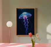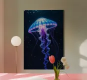 Une représentation époustouflante d'une méduse de haute mer rougeoyante dérivant dans les profondeurs de l'océan noir. Sa cloche transparente rayonne d'une lueur bleue et violette pulsée, tandis que ses vrilles délicates, semblables à des rubans, se balancent avec un mouvement gracieux. De minuscules particules de lumière flottent autour d'elle, imitant la beauté céleste d'un ciel nocturne océanique. Cette peinture met en évidence la merveille surréaliste des créatures marines bioluminescentes, mêlant le réalisme à une esthétique presque onirique. Le contraste entre la lumière rayonnante et la profondeur des abysses renforce la présence éthérée de la méduse.