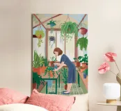 Une femme est agenouillée au milieu de plantes florissantes suspendues dans une serre, entièrement absorbée par un rituel doux et vivifiant.