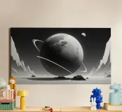 Une grande planète ornée d'anneaux flotte au-dessus d'un terrain aride, tandis que des corps célestes lointains illuminent le ciel étoilé. Les ombres des montagnes ajoutent de la profondeur à ce décor surréaliste.