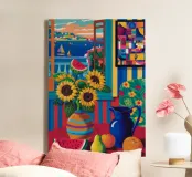 Une vibrante nature morte de tournesols dans un vase rayé et un pichet bleu, posés sur une table orange avec des fruits. La scène est encadrée par une fenêtre offrant une vue magnifique sur la mer et les bateaux éclairés par le soleil, créant ainsi une parfaite atmosphère de vacances d'été.