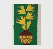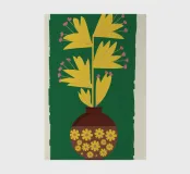 Nature morte simple d'un bouquet de fleurs jaunes dans un vase blanc, sur un fond vert uni. La composition est minimaliste, fraîche et a un aspect propre, moderne et joyeux.
